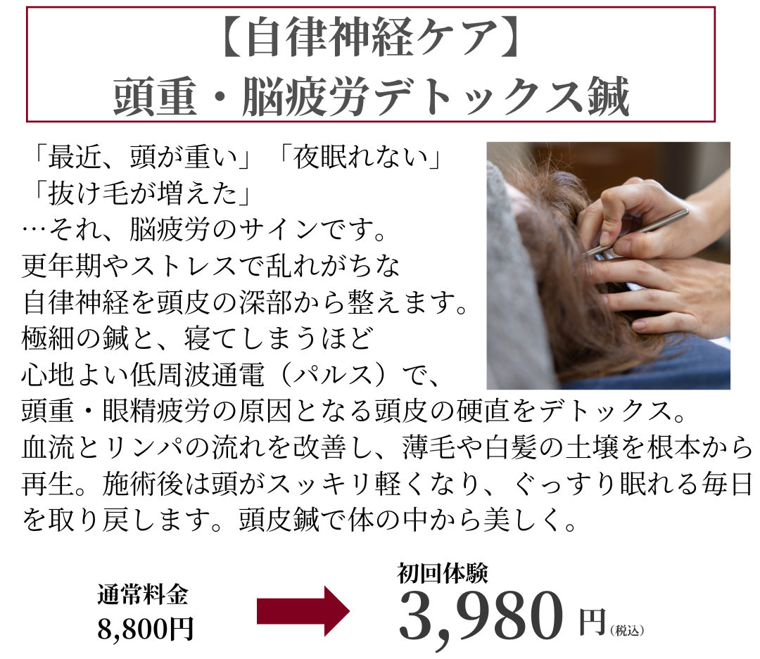 鍼灸・耳つぼ・美容鍼・頭皮鍼を組み合わせた施術 で、めぐりを整え、心地よさを目指します。